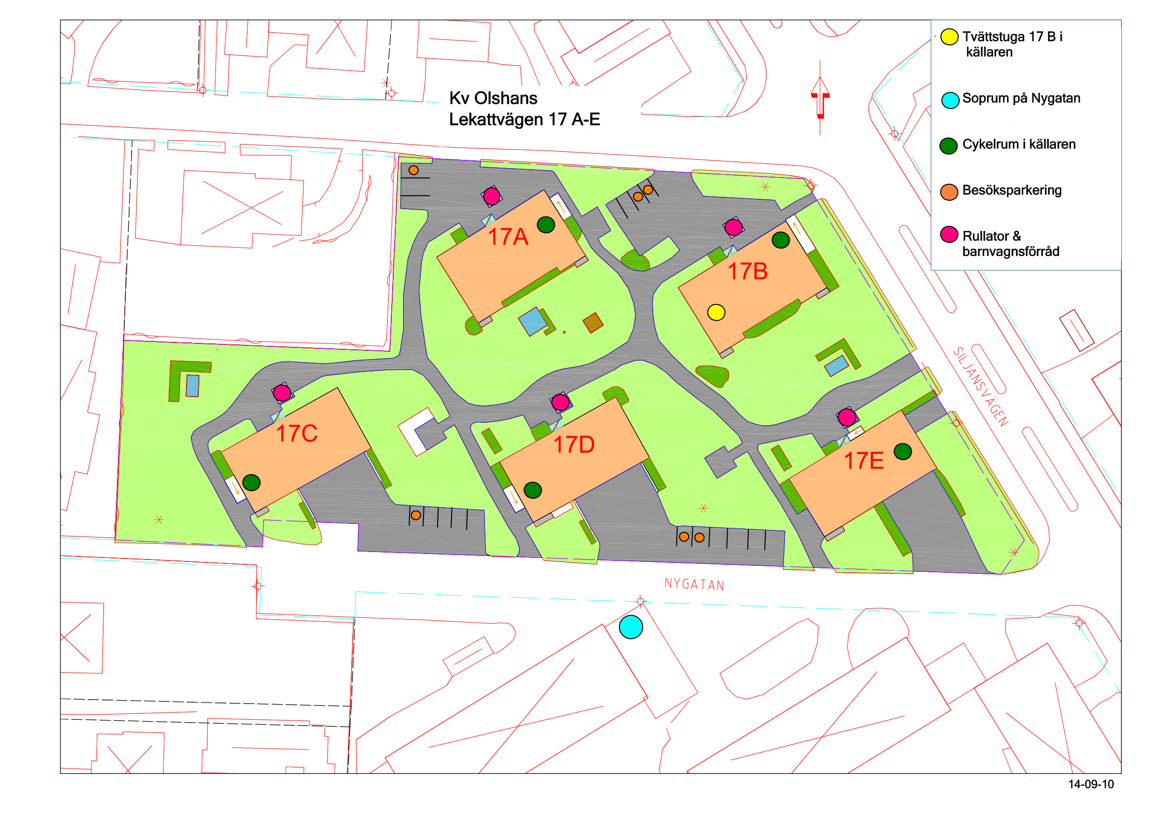 Tvättstuga i huset bredvid. Förråd i källarplanet. Rullator- och barnvagnsförråd i anslutning till entrén.